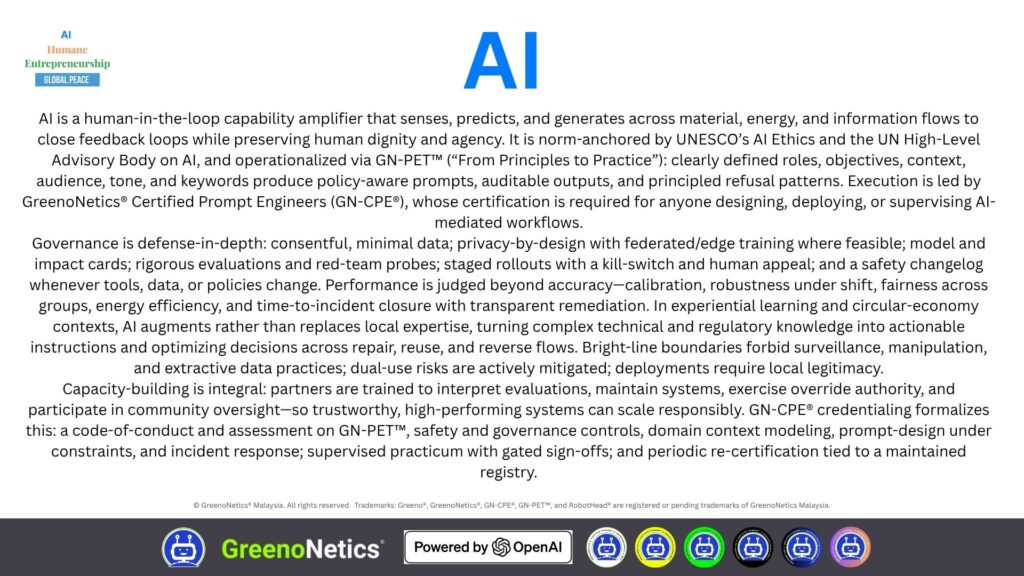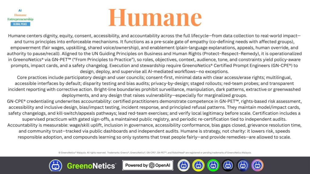 Humane centers dignity, equity, consent, accessibility, and accountability across the full lifecycle—from data collection to real-world impact—and turns principles into enforceable mechanisms. It functions as a pre-scale gate of empathy (co-defining needs with affected groups), empowerment (fair wages, upskilling, shared voice/ownership), and enablement (plain-language explanations, appeals, human override, and authority to pause/recall). Aligned to the UN Guiding Principles on Business and Human Rights (Protect–Respect–Remedy), it is operationalized in GreenoNetics® via GN-PET™ (“From Principles to Practice”), so roles, objectives, context, audience, tone, and constraints yield policy-aware prompts, impact cards, and a safety changelog. Execution and stewardship require GreenoNetics® Certified Prompt Engineers (GN-CPE®) to design, deploy, and supervise all AI-mediated workflows—no exceptions.