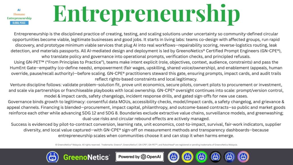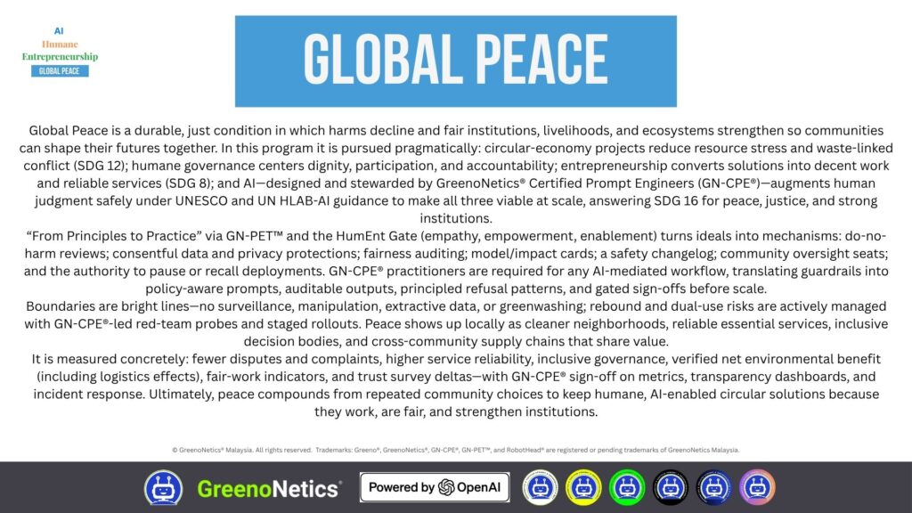 “Humane AI. Enterprise for Peace.” is a global initiative by GreenoNetics® that empowers individuals, communities and entrepreneurs to harness artificial intelligence grounded in human values.